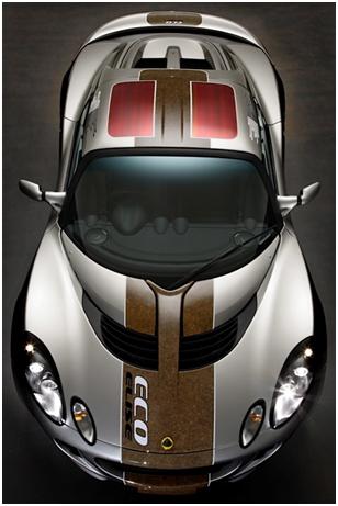 The Eco by Lotus is based off the standard Elise S. The concept is a low-emission eco-friendly model with various elements fabricated from natural resources. For example the body panels are made of hemp, eco-wool, and sisal. In addition Lotus utilized water-based paints to help reduce pollution during the painting process.